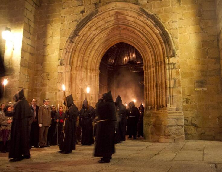 Tras las puertas cerradas de la concatedral los penitentes de la que es sin duda una de las cofradías más singulares de Cáceres esperan la llamada que dará la salida.