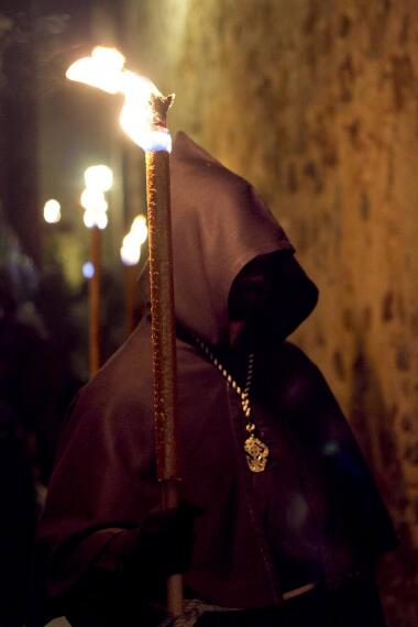La única luz permitida es la que desprenden las antorchas que llevan los integrantes de la cofradía.
