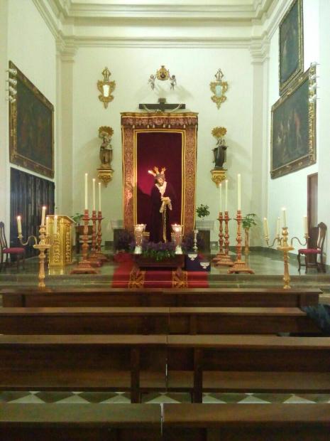 Con el templo totalmente a oscuras, con la sola iluminación de unos candeleros del palio de la Virgen de la Merced,